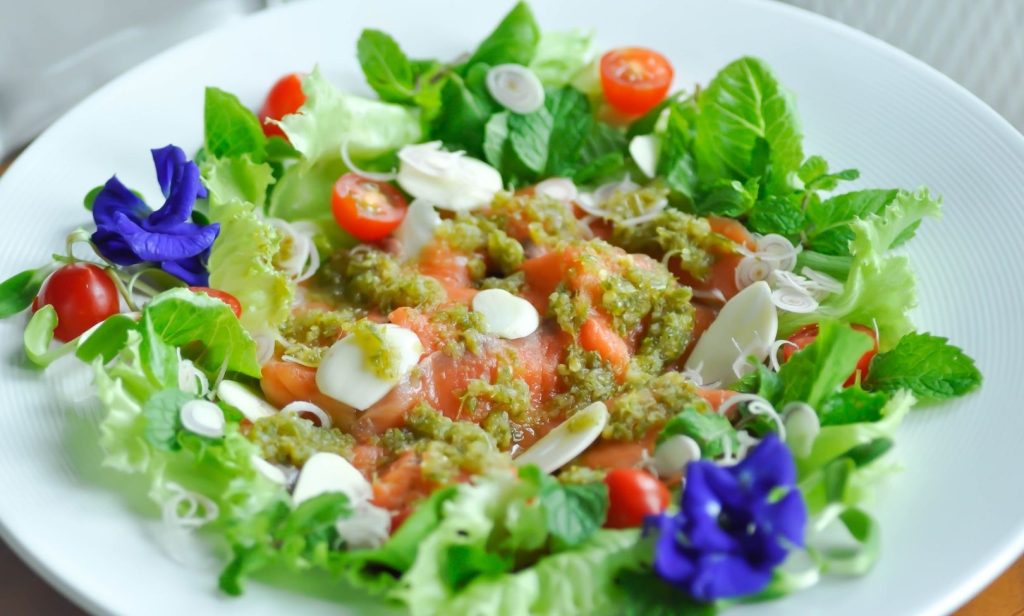 เมนูจากแซลมอน เมนูที่ 4 จะพาเพื่อน ๆ ไปทำเมนูแซ่บ ๆ แบบไทย ๆ ทานกันสักหน่อย กับเมนู ยำปลาแซลมอน เนื้อปลาสด ๆ เด้ง ๆ ไม่ต้องทำสุกก็สามารถทานได้เลย เพียงนำไปคลุกเคล้ากับวัตถุดิบไทย ๆ อย่างเช่น พริก กระเทียม มะนาว และปรุงน้ำยำให้ได้ 3 รส คือ เผ็ด เปรี้ยว หวาน แซ่บตามรสชาติที่ชอบ จัดจ้านสุด ๆ