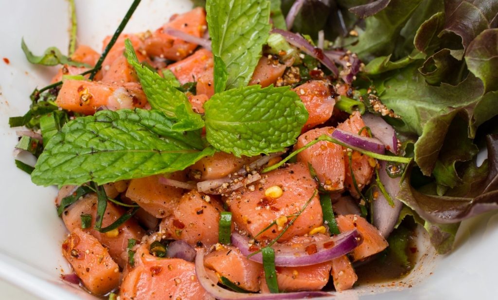 ปิดท้ายด้วยเมนูที่ 5 ลาบปลาแซลมอน ใครยังไม่เคยลอง บอกเลยต้องห้ามพลาด! ลองแล้วอาจจะติดใจก็ได้นะคะ อร่อยไม่แพ้เมนูลาบอื่น ๆ อย่างแน่นอน แถมยังทำกินได้ง่าย ๆ ไม่ยุ่งยาก ใช้วัตถุดิบน้อยนิดแค่มีเนื้อปลาแซลมอนแบบเต็มชิ้น หรือเป็นเศษชิ้นเล็กชิ้นน้อย ก็ทำกินได้ และรสชาติสามารถปรุงได้ตามใจชอบ