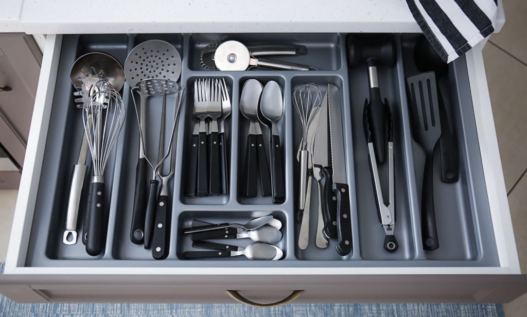 สำหรับไอเทมเด็ด ๆ ที่ควรจะมีติดครัวอีกอย่าง นั่นก็คือ ถาดแบ่งช่องในลิ้นชัก บางคนอาจไม่เคยคิดว่าจำเป็นต้องใช้ แต่ถ้ามีไว้ก็ดีไม่น้อยเลยค่ะ เพราะช่วยทำให้เราหาของที่ต้องการได้ง่าย โดยเฉพาะของใช้ หรืออุปกรณ์ครัวชิ้นเล็ก ๆ อย่างที่เปิดขวด มีดปอกผลไม้ ที่ตัดพิซซ่า กรรไกร โดยเราสามารถนำมาจัดวางแยกช่องกัน หรือของที่อยู่ในหมวดการใช้งานประเภทเดียวกัน อาจจะใส่รวมไว้ในช่องเดียวกันก็ได้ เวลาที่ต้องใช้แค่เปิดลิ้นชักดู ก็สามารถหยิบของที่ต้องการออกมาใช้ได้เลย