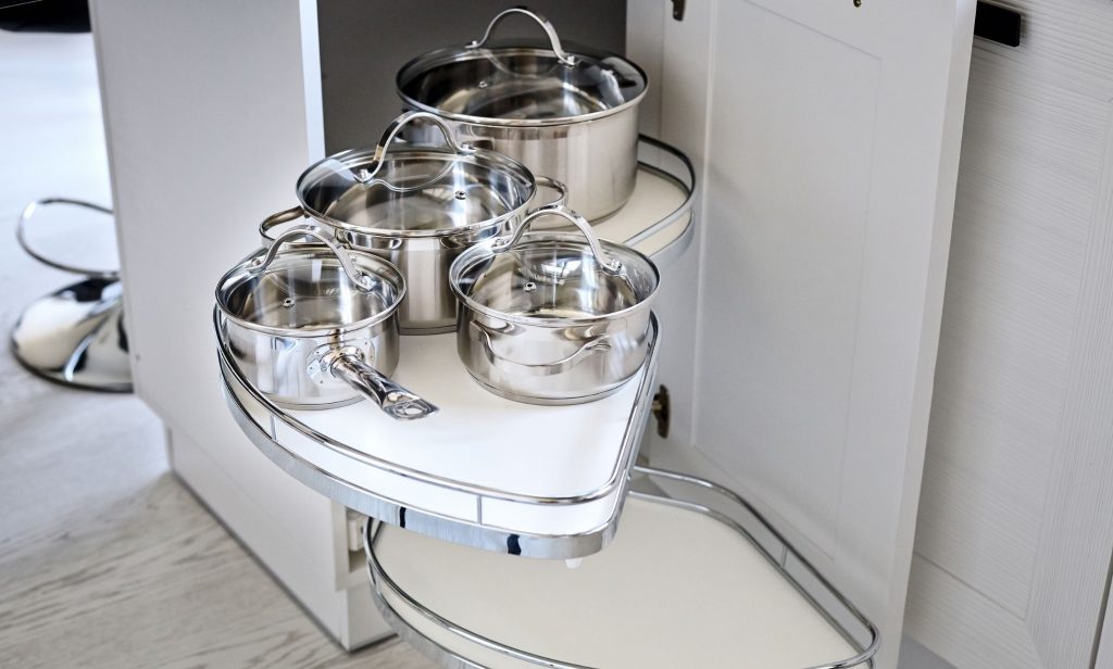 เมื่อไม่ได้ใช้งานกระทะหรือหม้อแล้ว ภายหลังจากการทำความสะอาด และผึ่งลมทิ้งไว้จนแห้งสนิท เราสามารถของใช้เหล่านี้ ไปจัดเก็บบนตะแกรง หรือชั้น ที่ติดตั้งอยู่ภายในตู้ได้ หม้อและฝาหม้อเราควรจัดเก็บไว้คู่กัน รวมทั้งกระทะและฝาปิด เพราะหากต้องการใช้ก็จะสามารถหยิบมาใช้ได้ง่าย ประโยชน์ของการจัดเก็บกระทะหรือหม้อบนตะแกรง คือ ช่วยให้ครัวโล่งสะอาดตา ภาชนะระบายอากาศได้ดี ไม่มีกลิ่นอับ นอกจากนี้ยังมีความสะอาด ลดการปนเปื้อนของเชื้อโรคได้ดีกว่าการล้างและวางไว้ด้านนอกค่ะ แต่หากตู้เก็บของไม่มีตะแกรงหรือชั้นวาง เพื่อน ๆ ก็สามารถหาซื้อและนำมาติดตั้งเพิ่มได้ค่ะ