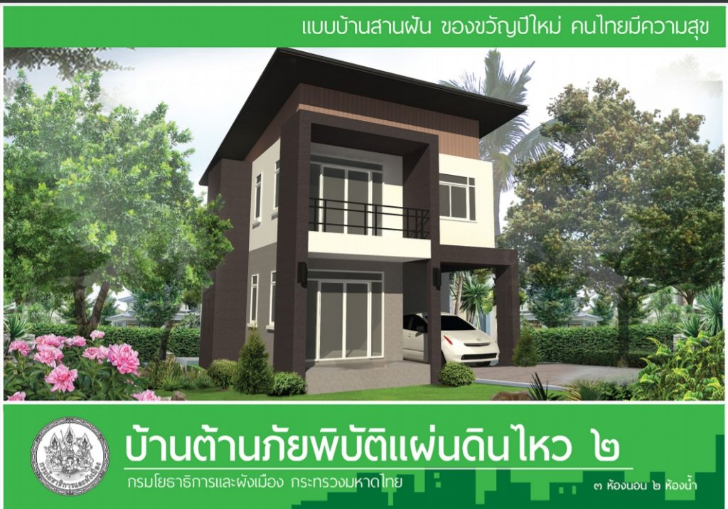 แบบบ้านที่ออกแบบมาเพื่อต้านภัยพิบัติแผ่นดินไหวโดยเฉพาะ มีความแข็งแรง ทนทาน ทนต่อแรงกระแทกได้เป็นอย่างดี เป็นแบบบ้าน 2 ชั้น ขนาด 3 ห้องนอน 2 ห้องน้ำ ออกแบบพื้นที่เรียบง่าย เหมาะกับครอบครัวขนาดปานกลางถึงใหญ่ ตอบโจทย์การใช้ชีวิตของผู้อยู่อาศัย