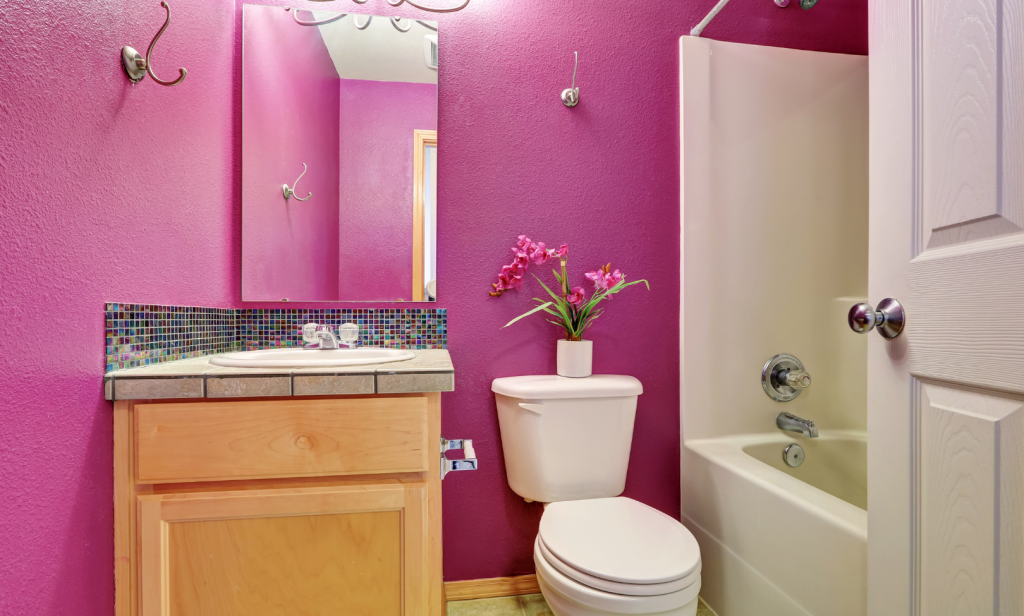 การตกแต่ง โทนสีห้องน้ำ ด้วยสีชมพู ไม่ใช่เรื่องยากเลยค่ะ เพราะสีชมพูเข้าได้ง่ายกับหลาย ๆ เฉดสี ให้ความรู้สึกอารมณ์ดี อบอุ่น ปลอดภัย การจับคู่สีชมพูกับสีอื่น ในการตกแต่งห้องน้ำ จะสื่อถึงอารมณ์ที่แตกต่างกันไป การทาสีห้องน้ำเป็นสีชมพู และตกแต่งด้วยอุปกรณ์ เฟอร์นิเจอร์สีทอง จะให้ความรู้สึกหรูหรา ทันสมัย สไตล์เจ้าหญิง หรือการตกแต่งสีชมพูกับสีขาว จะทำให้ห้องดูเรียบง่าย แต่สะดุดตาได้ดี สำหรับใครที่ชอบความสดใส ลองตกแต่งห้องน้ำสีชมพู ร่วมกับของใช้ในห้องน้ำ หรือเฟอร์นิเจอร์ หลายหลายสี เช่น สีเขียวอ่อน สีส้มอ่อน สีฟ้าอ่อน และสีขาว