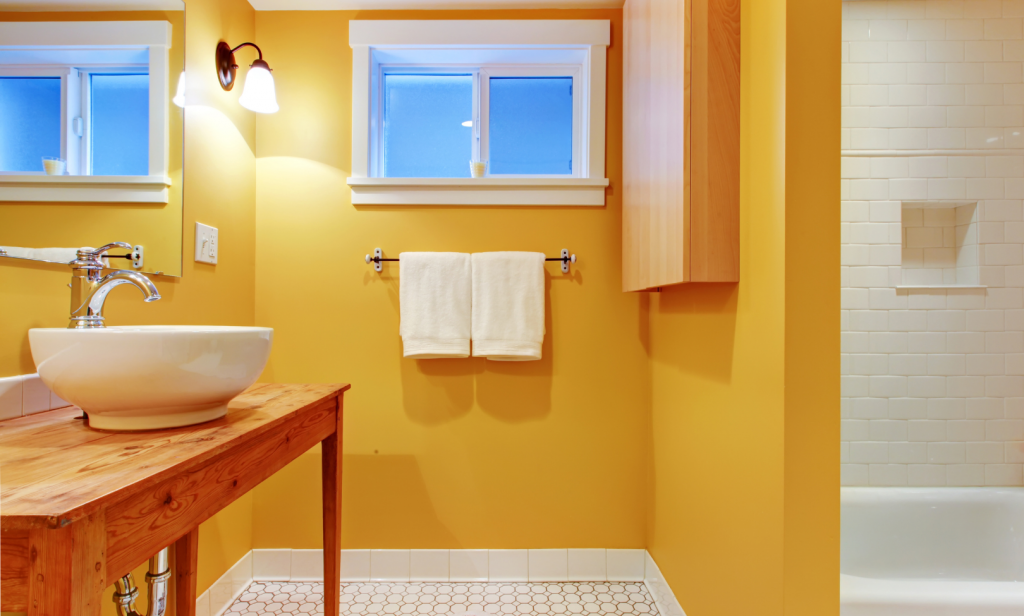 หากต้องการเปลี่ยนสีห้องน้ำสีเดิม ๆ ให้มีสีสันสดใส โทนสีสว่าง อย่างสีส้ม จะช่วยตอบโจทย์ได้อย่างดี สีส้มเป็นสีแห่งความร่าเริง สนุกสนาน สดใส ความสุข ความอบอุ่น เพื่อน ๆ สามารถปลดล็อคความเป็นตัวของตัวเอง โดยการตกแต่งห้องน้ำให้มีสีสัน มีชีวิตชีวา โทนสีส้มเข้ากันได้ดี กับสีสว่างอย่างสีขาว ลองตกแต่งห้องน้ำ โดยการแบ่งโซนสี เช่น ทาสีห้องน้ำสีส้ม แล้วเลือกใช้เฟอร์นิเจอร์ ของประดับห้องต่าง ๆ เป็นสีขาว หรืออาจจะใช้พื้นห้องน้ำสีส้ม เฟอร์นิเจอร์สีส้ม แล้วส่วนอื่น ๆ ของห้องน้ำเป็นสีขาว ก็ดูเก๋ไปอีกแบบ ไม่เพียงสีขาว เท่านั้นที่เข้าได้ดีกับสีส้ม สีอื่น ๆ อย่างเช่น สีเทา สีดำ สามารถน้ำมาตกแต่งร่วมด้วยได้เช่นกัน