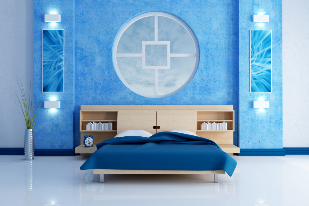เป็นอีกหนึ่ง ไอเดียแต่งห้องนอน วิธีง่ายๆ เพื่อไม่ให้จำเจ และเพิ่มความโดดเด่นให้กับ ห้องนอนสีฟ้า ของเพื่อนๆ ด้วยการทาสีฟ้าที่ผนังด้านใดด้านหนึ่ง นิยมตกแต่งในส่วนของส่วนที่เป็นไฮไลท์ของห้อง เช่น ผนังหลังหัวเตียง ผนังที่วาง TV ผนังหลังโซฟา หรือเลือกทาบนผนังห้องตรงที่สายตาเรามองเห็นบ่อยๆ จะช่วยทำให้ห้องดูมีมิติมากขึ้น เท่านี้ห้องนอนสุดโปรดก็ดูสวยขึ้นแล้วค่ะ