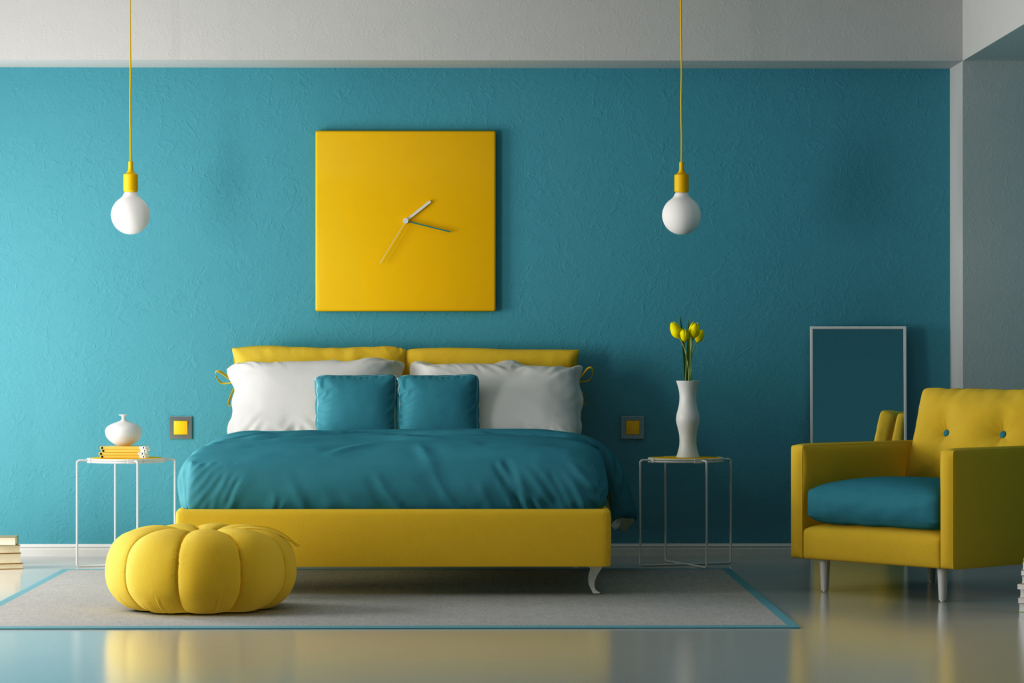 เป็นคู่สีที่ให้อารมณ์แตกต่างกัน โดยสีฟ้าให้ความรู้สึกผ่อนคลายเป็นสีโทนเย็น ส่วนสีเหลืองให้ความรู้สึกสนุกสนานร่าเริงและเป็นสีโทนอบอุ่น เมื่อทั้งสองสีมาอยู่ด้วยกันจะทำให้ห้องดูมีสีสันสดใส สนุกสนาน มีชีวิตชีวายิ่งขึ้น