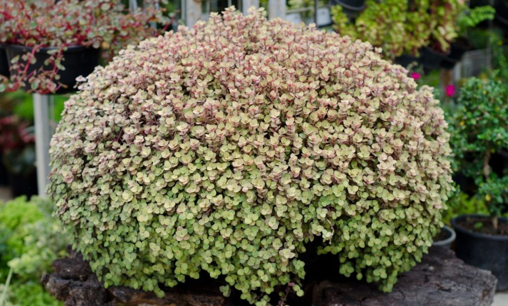 ใบมีขนาดเล็กมีความยาวไม่เกิน 2.5 เซนติเมตร ลำต้นอวบน้ำแตกกิ่งก้านได้ดี แต่ถ้าได้รับแสงแดดจัด ใบจะมีสีอมชมพูข้อปล้องจะสั้นและแตกยอดใหม่เยอะทำให้ใบดกเป็นพุ่มสวยงาม