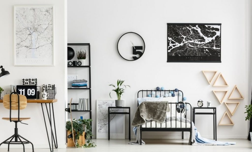 ถ้าห้องนอนสีขาวดำของเพื่อน ๆ มีผนังห้องเป็นสีขาว ซึ่งข้อดีก็คือให้ความสว่างดู เป็นธรรมชาติ แต่นั่นก็อาจจะทำให้ห้องดูจืดชืดมากเกินไป เราสามารถเพิ่มลูกเล่นให้กับผนังสีขาว ได้ด้วยการตกแต่งงานศิลปะต่าง ๆ ไม่ว่าจะเป็น กรอบรูปลวดลายโทนขาวดำ ชั้นวางของน่ารัก ๆ หรือจะเลือกเพ้นท์ลายศิลปะสีดำตามแบบที่ชอบ ล้วนทำให้ห้องดูมีความน่าสนใจมากขึ้นนะคะ