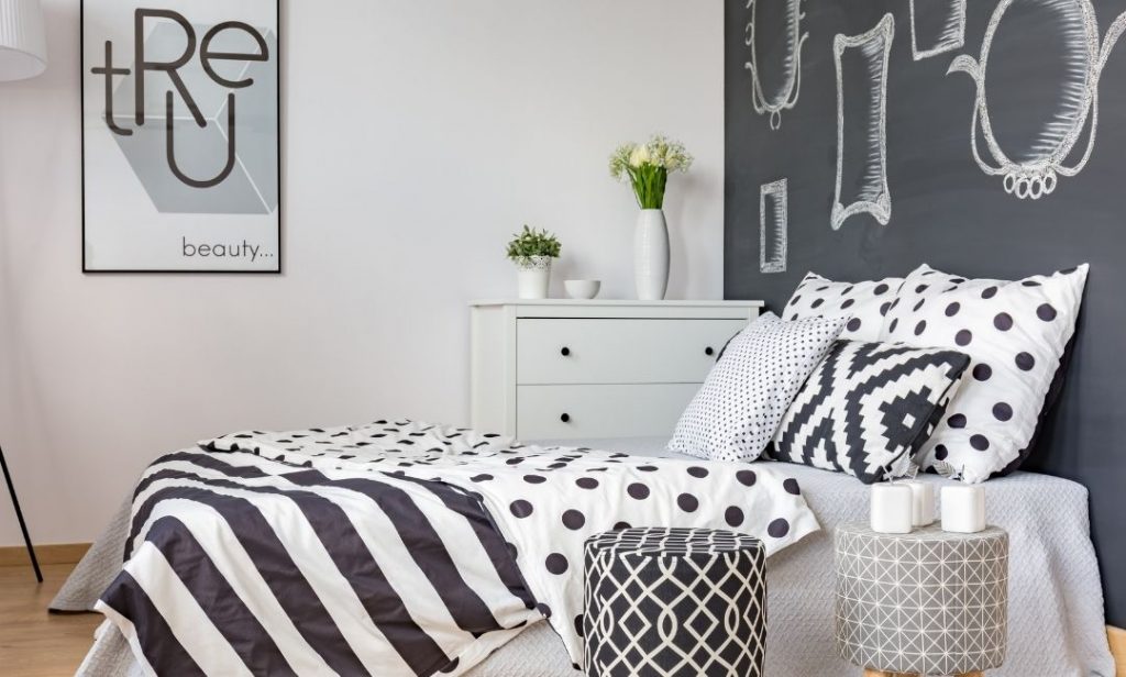 ห้องนอนที่ดูสนุก ไม่จำเป็นต้องเต็มไปด้วยสีสันเสมอไป เราสามารถเพิ่มลูกเล่นบางอย่างที่น่าสนใจได้ อย่างเช่น การติดภาพศิลปะบนฝาผนัง และบนหัวเตียง ให้มีลวดลายทำให้ห้องดูนุ่มนวลมากขึ้น โดยใช้สีขาวดำลวดลายต่าง ๆ มาตกแต่ง ไม่ต้องกังวลว่าจะเหมือนกับสีผนังจนเกินไป หรือหากจะเพิ่มสีสันให้มากขึ้น ก็ไม่ควรเกิน 1 หรือ 2 สีนะคะ เท่านี้ก็ทำให้การ แต่งห้องสีขาวดำ ดูโดดเด่นขึ้นมาได้แล้วค่ะ
