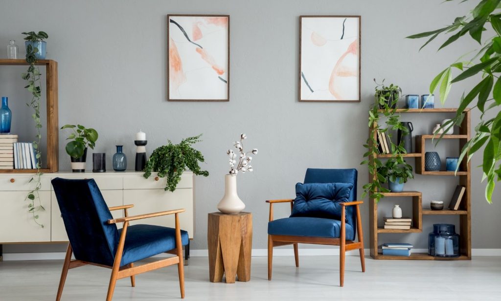 การตกแต่งภายในห้องสีเทา เราสามารถเน้นกลิ่ยอายความคลาสสิก โดยใช้เฟอร์นิเจอร์เป็นสีน้ำเงิน และเพิ่มกลิ่นอายความเป็นของธรรมชาติ ด้วยวัสดุไม้ อีกทั้งยังสร้างความสบายตา สดชื่น ด้วยต้นไม้สีเขียว ถ้าถามว่า ห้องสีเทา เฟอร์นิเจอร์สีอะไรดี พี่ไว้ใจแนะนำ สีน้ำเงิน ก็เป็นอีกหนึ่งไอเดียที่น่าสนใจ