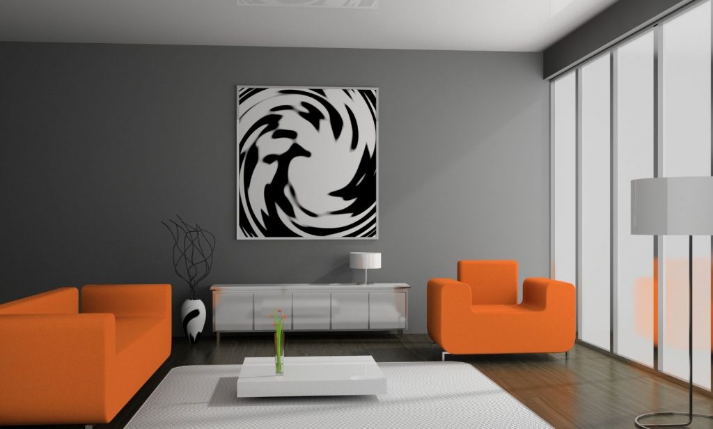 ปิดท้ายด้วยการตกแต่งห้องสไตล์โมเดิร์น โดยเลือกผนังด้วยสีเทาเข้ม เพิ่มความโดดเด่นด้วยการตกแต่งรูปเก๋ๆ บนผนัง ส่วนอีกด้านเป็นกระจกใส เพื่อใช้แสงธรรมชาติจากด้านนอก เข้ามาทำให้ห้องดูสว่างมากขึ้น นอกจากนี้ การเลือกใช้เฟอร์นิเจอร์สีส้ม ตัดกับห้องโทนสีเทาก็เป็นการผสมผสานสีที่ลงตัว