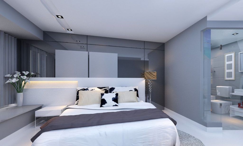 คงเป็นอีกหนึ่งโทนสีที่เราเห็นได้บ่อย คือ สีเทา แมทช์กับสีดำและสีขาว ซึ่งเป็นโทนสีที่จับมารวมกันแล้ว ให้ความรู้สึกสะอาดสบายตา เพิ่มความหรูหราด้วยโคมไฟข้างเตียง และแจกันสีขาว