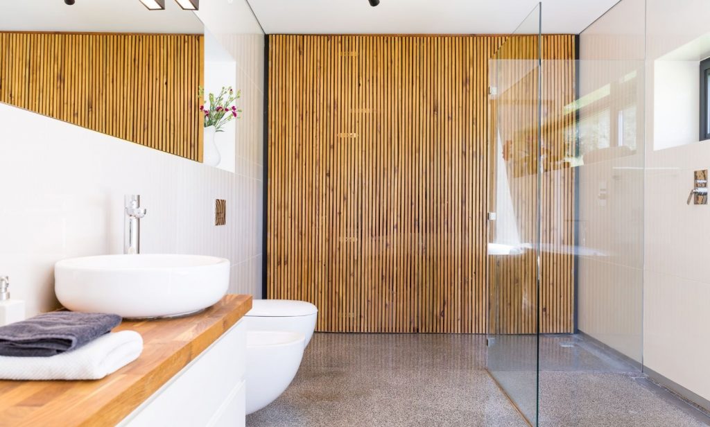การเสริมสไตล์ห้องน้ำในบ้านด้วย ไม้ระแนง นั้นสามารถทำได้โดย นำไม้มาออกแบบให้เป็นฉากกั้น แบ่งส่วนเปียกและส่วนแห้งในห้องน้ำอย่างชัดเจน หรืออาจจะใช้เป็นฉากกั้นแบ่งโซนแต่งตัวเปลี่ยนเสื้อผ้าสำหรับห้องน้ำที่มีพื้นที่กว้าง และตกแต่งฉากกั้นไม้ระแนงด้วยการติดที่แขวนผ้าขนหนู เสื้อผ้า หรือแขวนไม้ประดับ ก็สามารถสร้างความหรูหราในห้องน้ำขึ้นมาได้