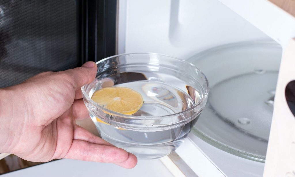 1. ใช้น้ำ 1 ถ้วย ผสมกับน้ำมะนาว 1 ลูก คนให้เข้ากัน หรืออีกวิธีก็คือ น้ำแอปเปิ้ลไซเดอร์ หรือน้ำส้มสายชู 2-3 ช้อนโต๊ะ ผสมกับน้ำ 1 ถ้วย แล้วนำเข้าไปอบในไมโครเวฟก็ได้เช่นกัน