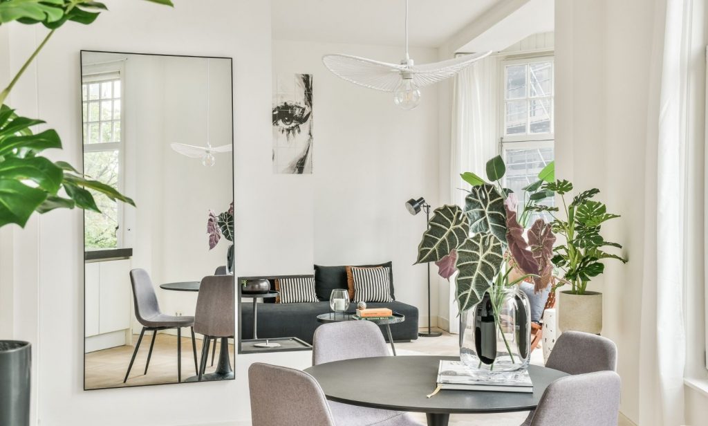 การแต่งห้องนั่งเล่นหรูหรา โดยการใช้กระจก จะทำให้ห้องดูมีมิติมากขึ้น เช่น การใช้หน้าต่างเป็นกระจกบานใหญ่ เพื่อให้แสงแดดยามเช้าส่องผ่านเข้ามาในห้อง หรือจะใช้เป็นกระจกเงาบานใหญ่ เน้นมิติให้กับห้องดูกว้างขึ้น เป็น ไอเดียห้องนั่งเล่น ที่เพื่อน ๆ สามารถทำได้ง่าย และประหยัดงบอีกต่างหาก
