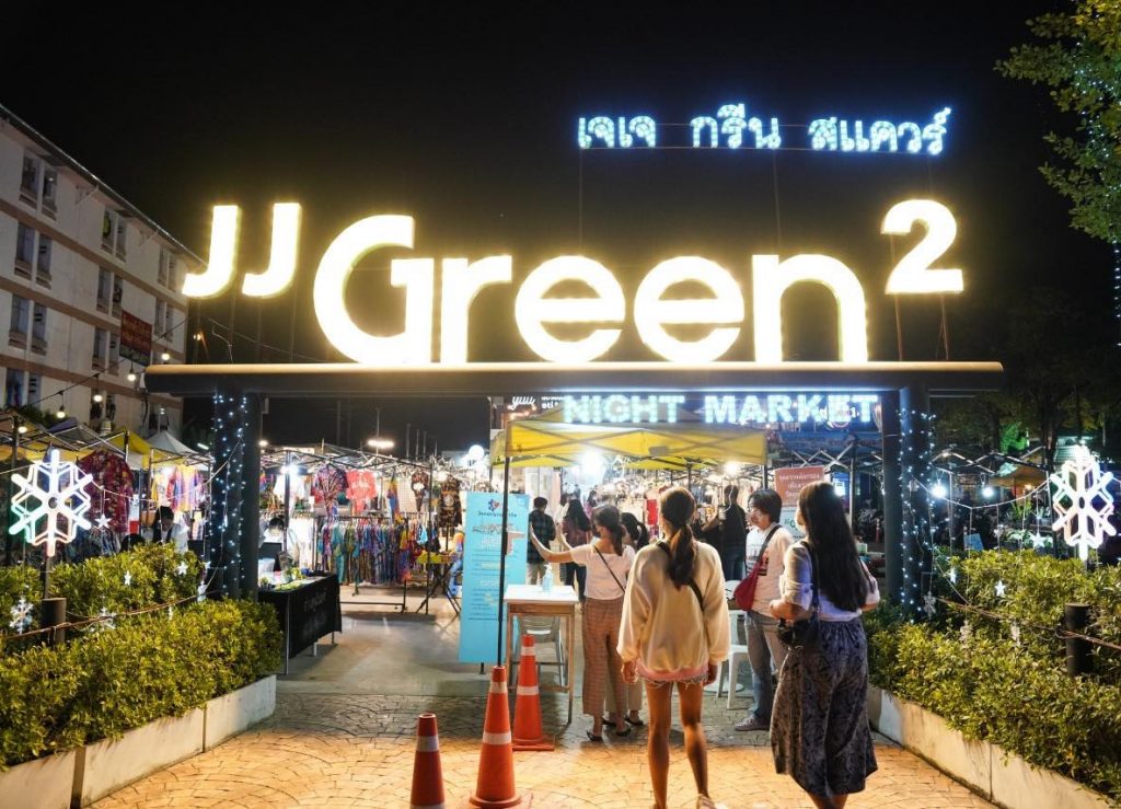 ตลาดเจเจ กรีน สแควร์ หรือ เจเจ กรีน 2 ตั้งอยู่ที่ เลียบคลองประปา ประชาชื่น ใกล้มหาวิทยาลัยธุรกิจบัณฑิตย์ จะมีนัดกันทุกๆ วันพฤหัสบดี ถึงวันอาทิตย์ ช่วงตั้งแต่หกโมงเย็น พบกับร้านเสื้อผ้า กระเป๋า รองเท้า ทั้งมือหนึ่งและมือสองอย่างหลากหลายสไตล์ ใครที่มีนัดสังสรรค์กับเพื่อนๆ พี่ไว้ใจแนะนำที่นี่เลยนะคะ เพราะจะมีทั้งร้านอาหารแบบให้นั่งชิลๆ และแนวสตรีทฟู้ด ให้เลือกกันมากถึงกว่า 120 ร้านค้า หากช้อปปิ้งกันจุใจแล้ว อย่าลืมใช้บริการวาดภาพเหมือน ติดไม้ติดมือกลับบ้านด้วยนะคะ