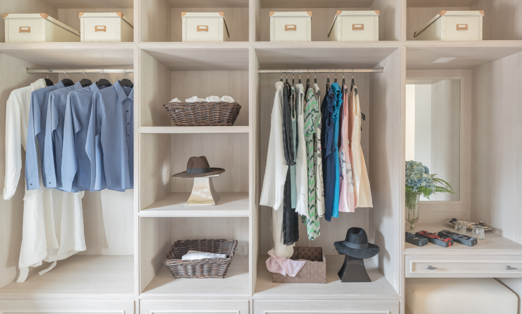 ถ้าหากบ้านของเพื่อน ๆ มีพื้นที่สำหรับตู้เสื้อผ้าที่จำกัด ให้เพื่อน ๆ เลือกใช้พื้นที่ว่างที่มีความสูง และมีขนาดกว้างพอ และติดตั้งชั้นวางของไว้ด้านบน เพื่อใช้เป็นพื้นที่สำหรับวางสิ่งของต่าง ๆ เพียงเท่านี้ก็จะมีพื้นที่แขวนเสื้อผ้ามากขึ้น โดยไม่จำเป็นต้องมีตู้เสื้อผ้า