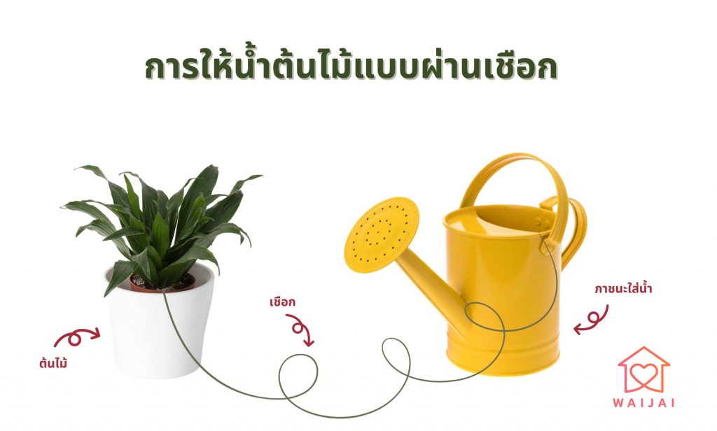 วิธีทำก็ง่าย ๆ ค่ะ ใช้ปลายเชือกข้างหนึ่งจุ่มลงไป ให้จมในภาชนะที่มีน้ำ ส่วนปลายเชือกอีกข้างให้วางลงบริเวณผิวดิน ด้านบนของต้นไม้ ปลายเชือกจากฝั่งภาชนะที่มีน้ำ จะมีการดูดซึมน้ำทีละนิด ไปยังปลายเชือกอีกฝั่ง ที่เป็นต้นไม้ของเรานั่นเองค่ะ